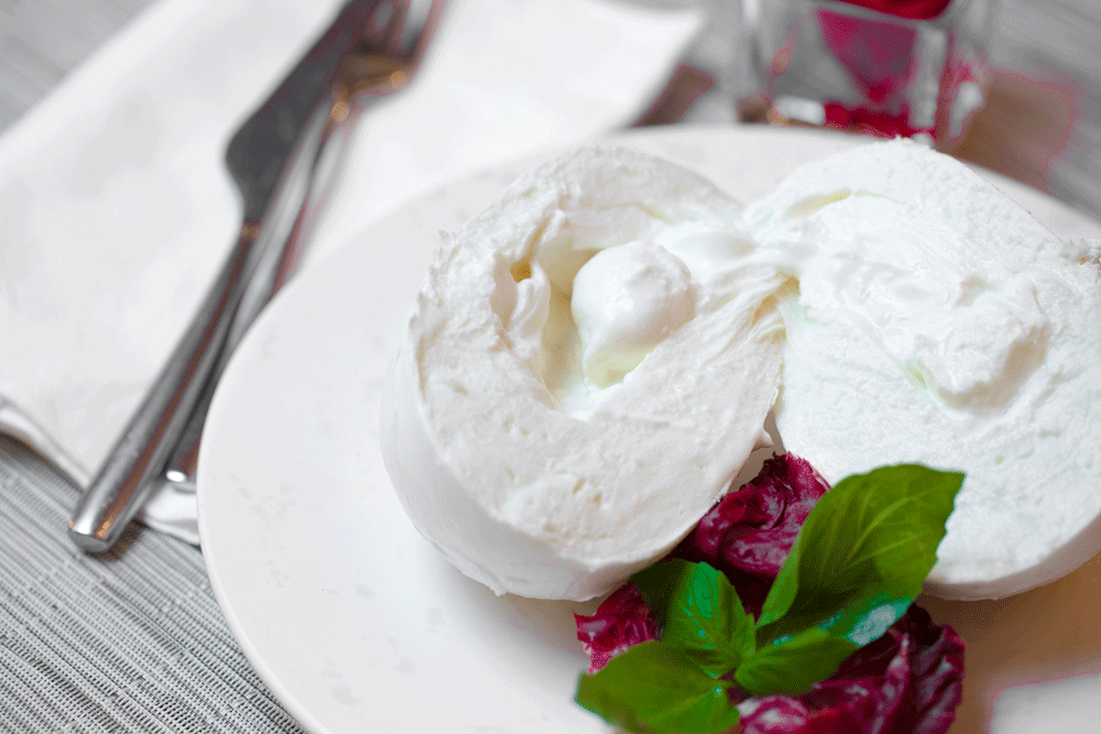La Burrata trouve ses origines au début du XXème siècle. Originaire de la région des Pouilles, elle est fabriquée à partir de mozzarella farcie manuellement de crème et de restes de mozzarella effilochée. Voilà d’où la burrata tient son cœur si crémeux et fondant !